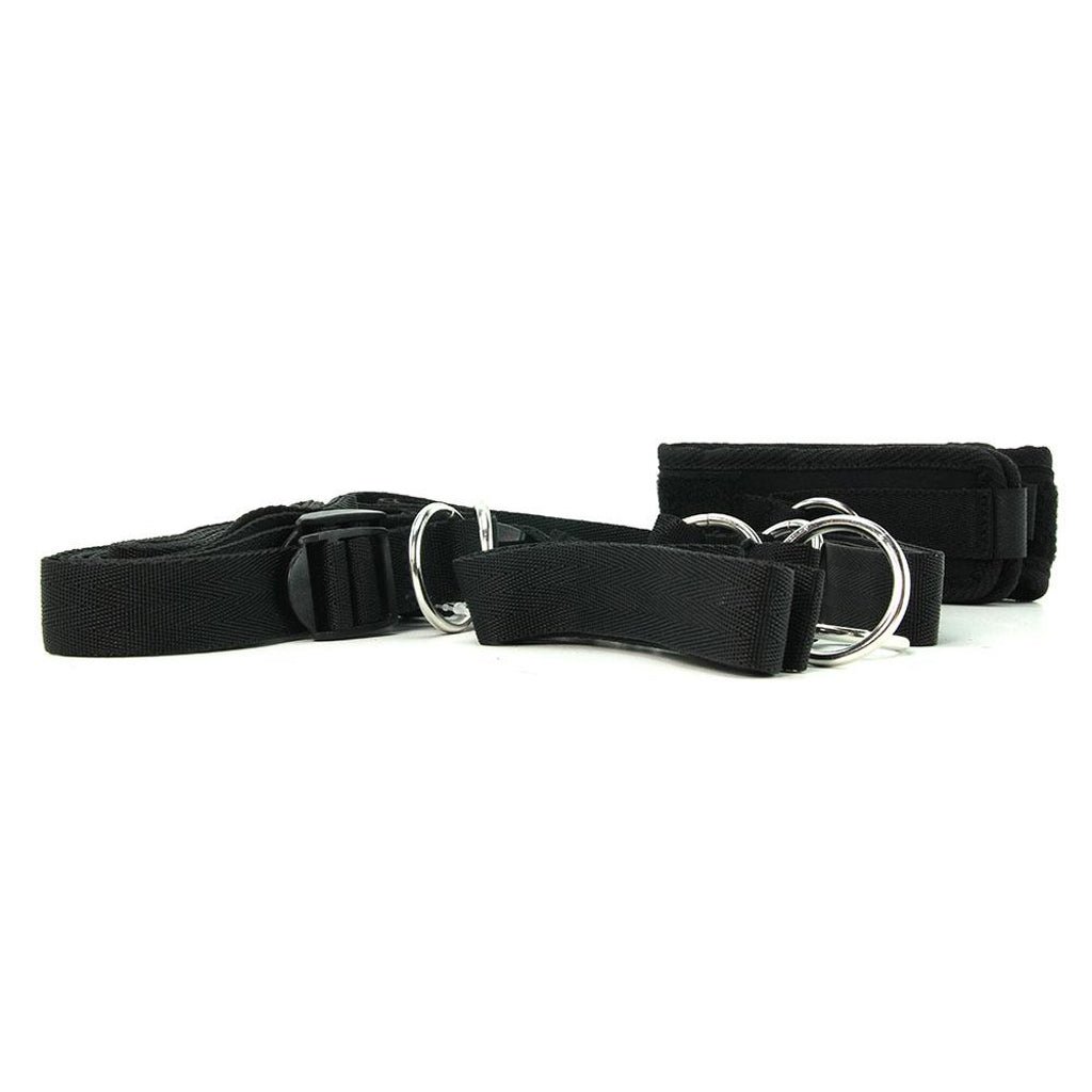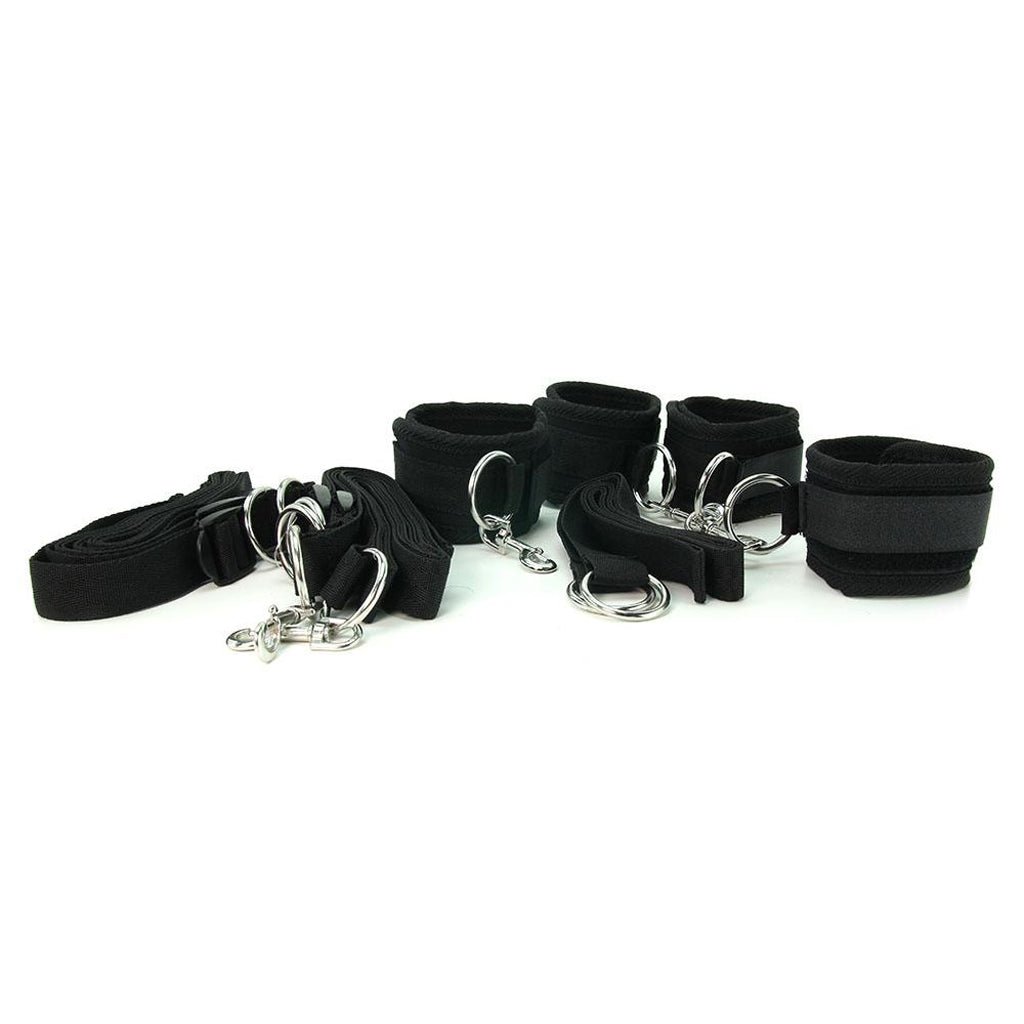 Allowing for all kinds of connectivity with cuffs, tethers and otherwise, the Spreader set contains four 5 foot (1.52m) straps and a midpoint attachment band that slip discreetly underneath (or around) bed configurations, attaching, in turn to four included black neoprene cuffs with sturdy swivel clips.