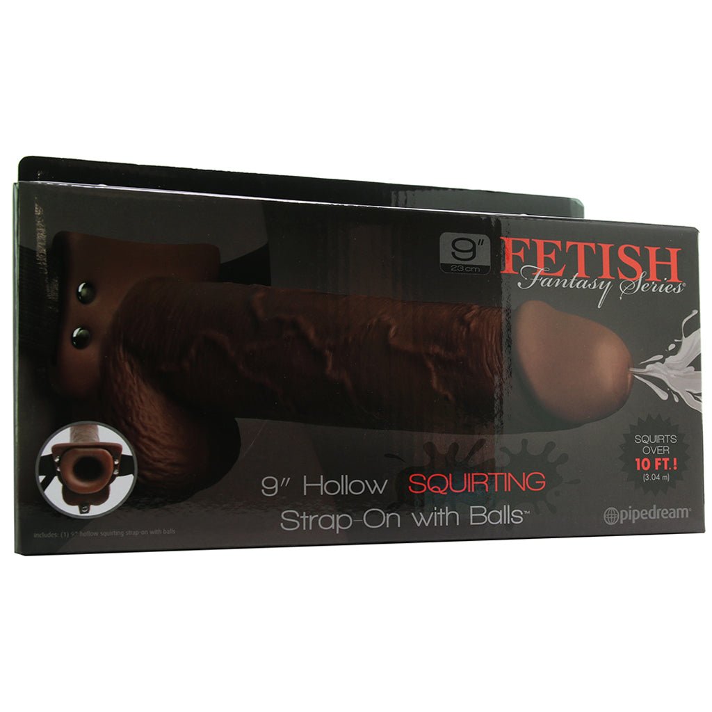 9 Inch Hollow Squirting Strap-On with Balls in Brown