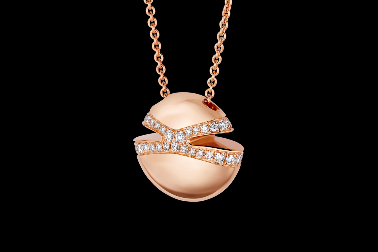 Born from the symmetrical union of two cabochons, creating a perfect harmony of volumes and shapes, the Bvlgari Cabochon necklace in 18 kt rose gold is a symbol of love and good fortune conveying a message of eternal love and happiness. Drawing inspiration from the smooth cabochon cut – an aesthetic Bvlgari signature since the 1950s that elevates the natural charm of gemstones – its design enhances the organic purity of gold, while the refined diamond pavé adds a touch of preciousness to the creation.