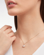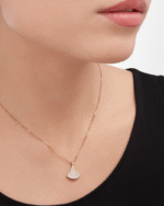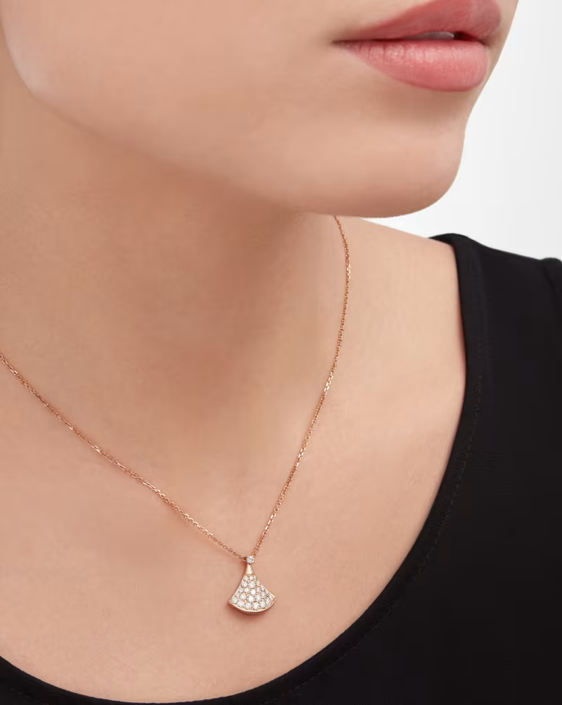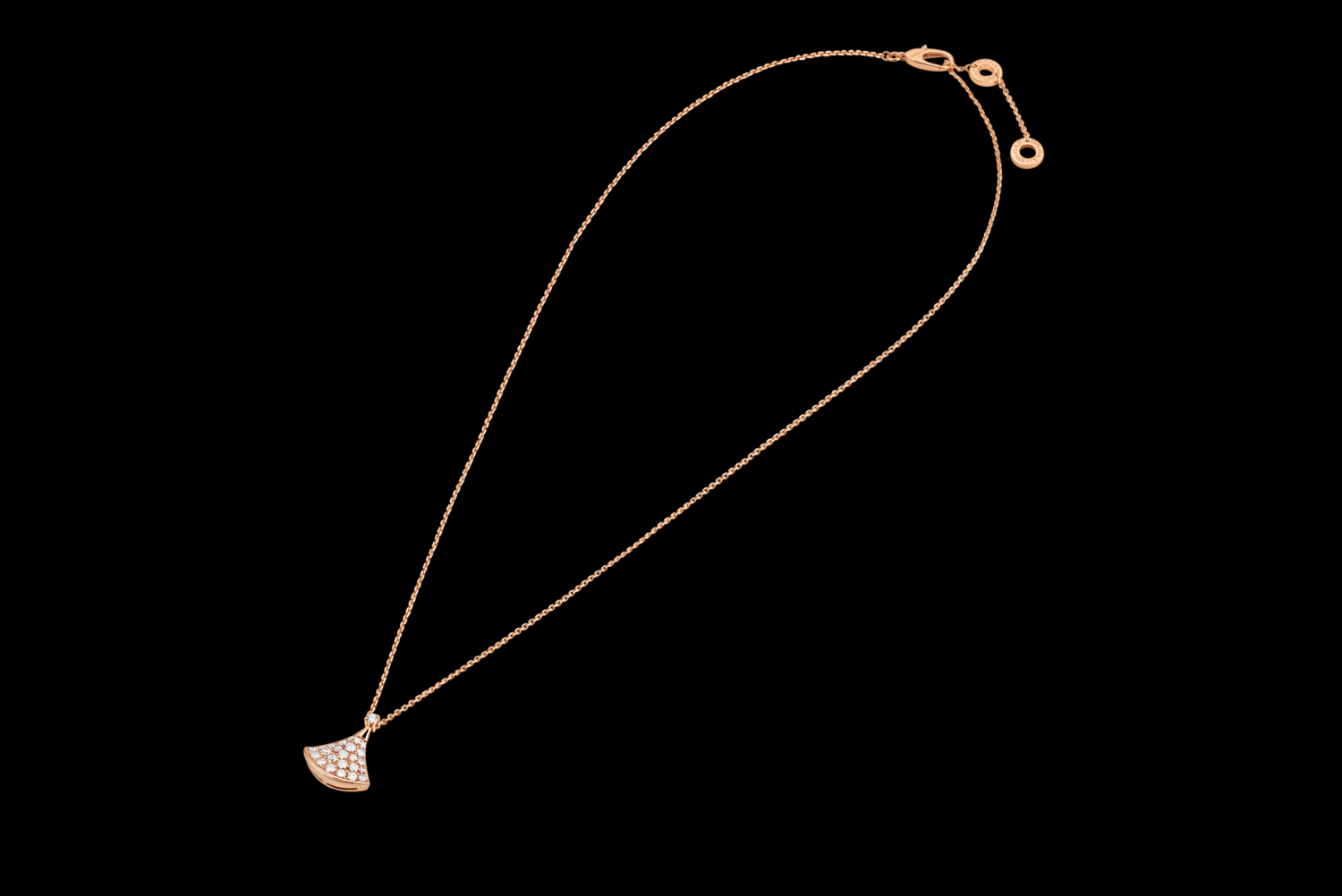 Inspired by feminine elegance and by the enchanting allure of the eternal city, the Divas’ Dream necklace pays homage to the most glamorous divas with an unmistakable Roman spirit. Quintessentially feminine and refined, the necklace is sculpted capturing the magnificence of the Caracalla Baths marble and the sensual curves of its fan-shaped mosaics, reflecting the very essence of Italian beauty. Crafted with the shimmering elegance of pavé diamonds and the feminine curves of the iconic fan-shaped motif, the Divas’ Dream necklace unveils its most precious facets. Divas’ Dream necklace in 18 kt rose gold with pavé diamonds. 16-17 in (41-43 cm) long.
