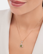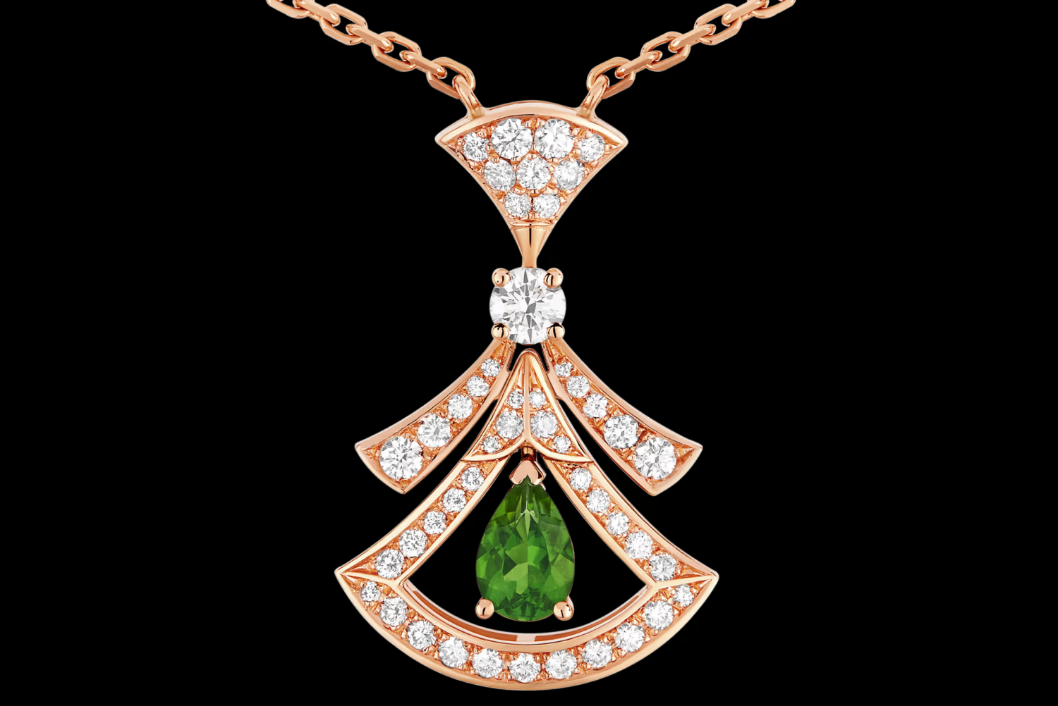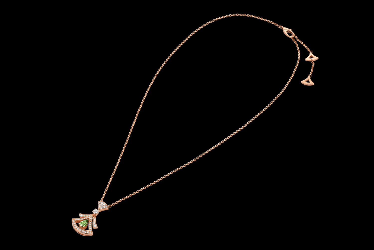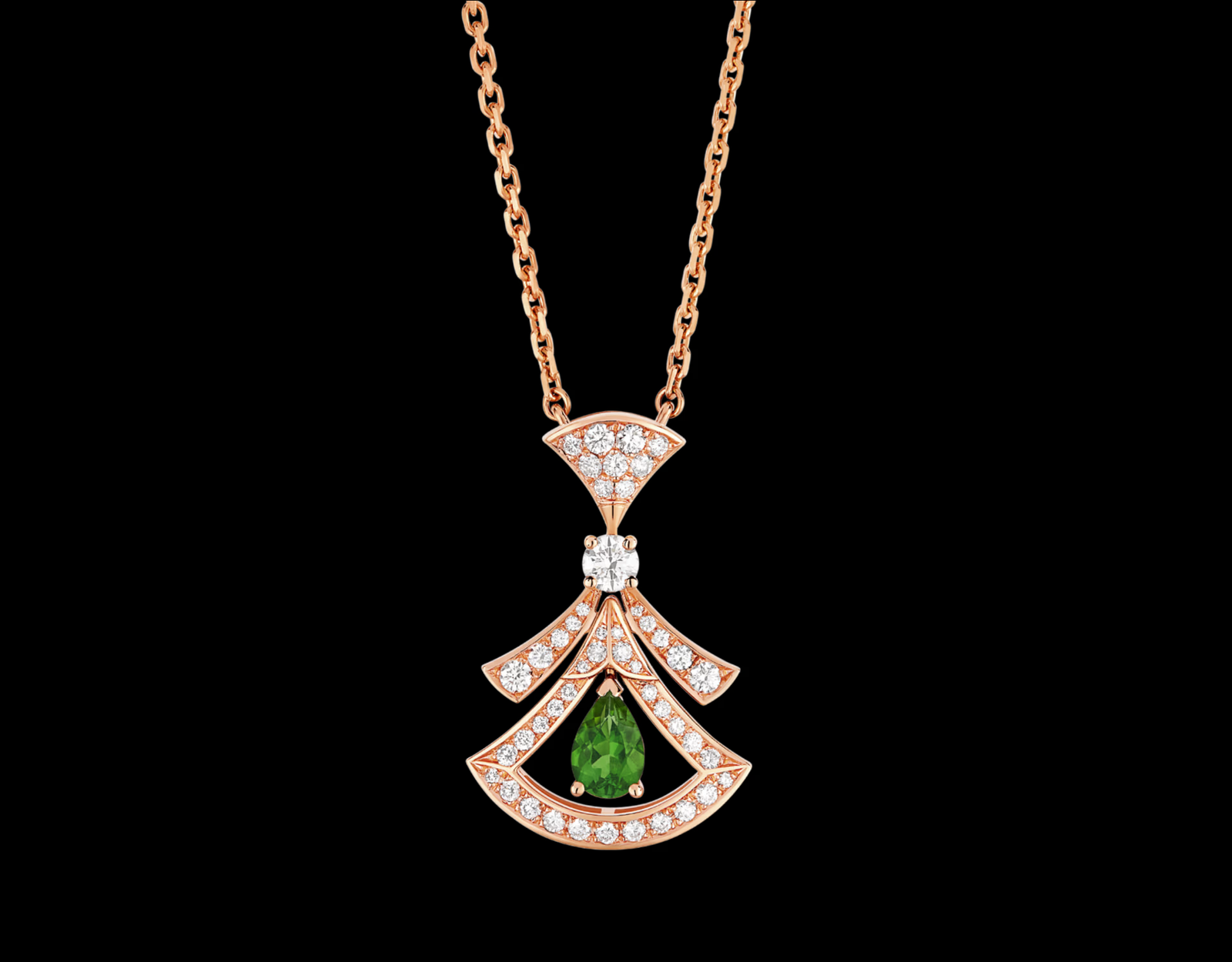 A refined expression of joyful femininity, the Divas’ Dream 18 kt rose gold necklace offers a sparkling and colorful interpretation of the iconic fan-shaped motif. Deeply rooted in Bvlgari’s Roman heritage, the aesthetic signature of the collection is rendered through a diamond set openwork pendant framing a pear-shaped green tourmaline that adds a vibrant touch to the jewel. Graceful and timeless, the creation is an ode to spontaneous beauty.