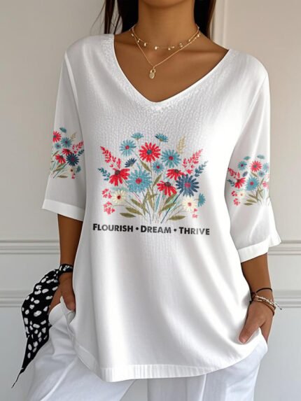 Women’s Fashion Casual Floral FDT Bubble Wrinkle Cotton and Linen Top