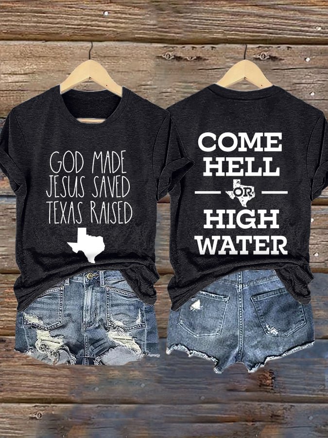 Retro God Made Jesus Saved Texas Raised Come Hell Or High Water Print T-Shirt