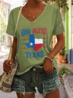 V-Neck Retro Texas Strong God Bless Texas Print T-Shirt