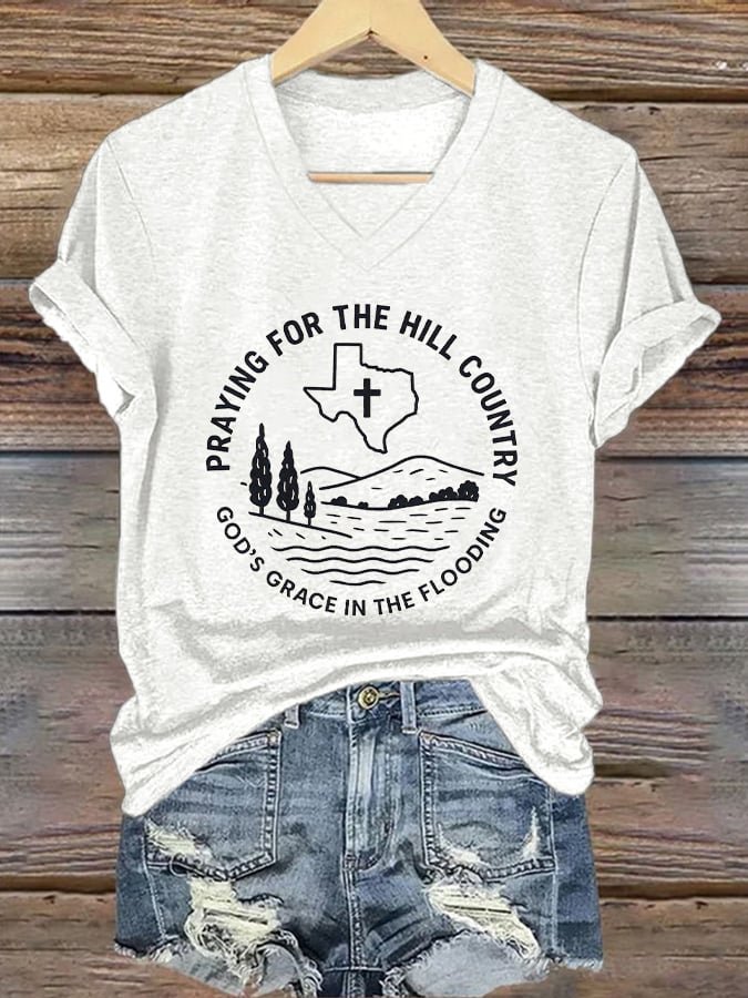 V-Neck Retro Texas Strong Praying For The Hill Country God’s Grace In The Flooding Print T-Shirt