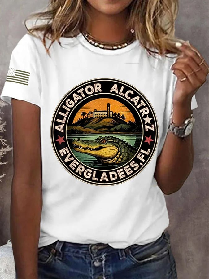 Women’s Alligator Alcatraz Funny Florida Everglades Dark Humor Patoitic Print T-Shirt